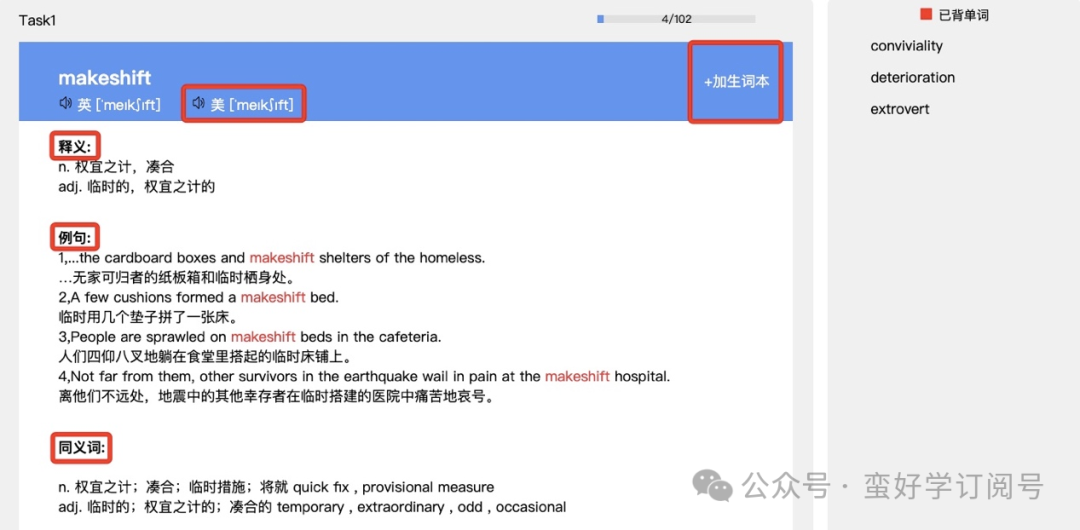 除此之外,蛮好学系统可以自定义单词本,自动将做题时遇到的难词生词总结出来,上传系统;还可以在背记时添加到生词本,快速复习。