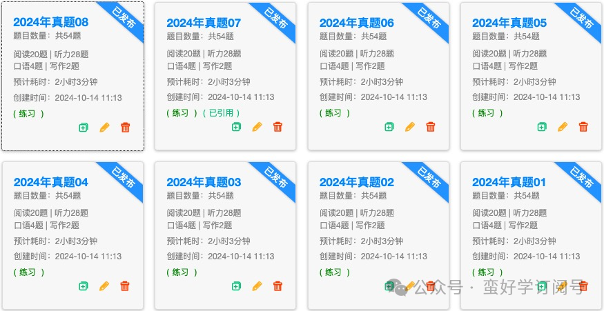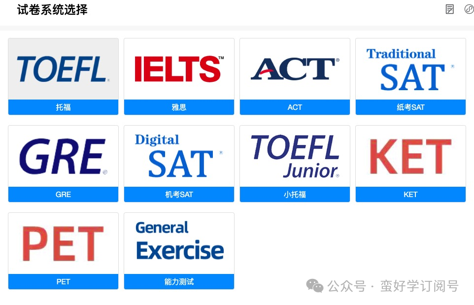 刷题对备考来说自然也是必不可少的,因此蛮好学系统也配备了主流考试的丰富题库,供同学们练习和复习使用,比如托福、雅思、SAT、GRE等考试。