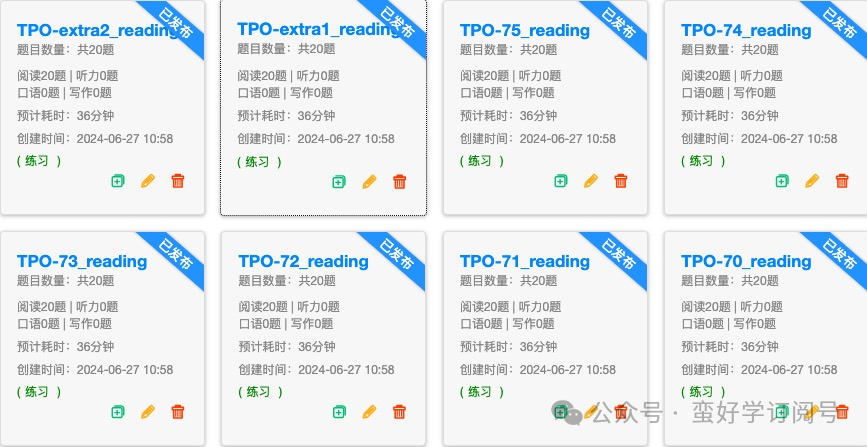 正如上文所说,蛮好学系统不仅里有经典模拟题,还有时刻更新的历年真题,以托福为例:77套TPO不是手到擒来。