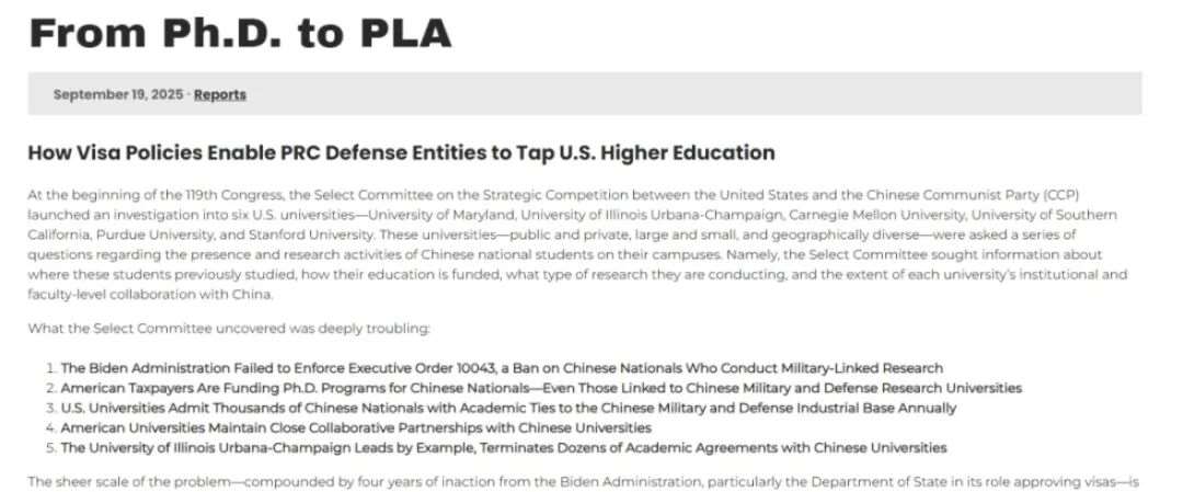 据悉这份名单是来自美国国会众议院下属的“美中战略竞争特别委员会”发布的一份标题为《从博士到解放军:签证政策如何让中国国防实体利用美国高等教育》的报告。