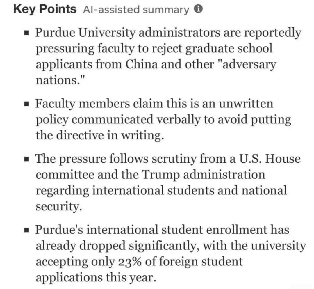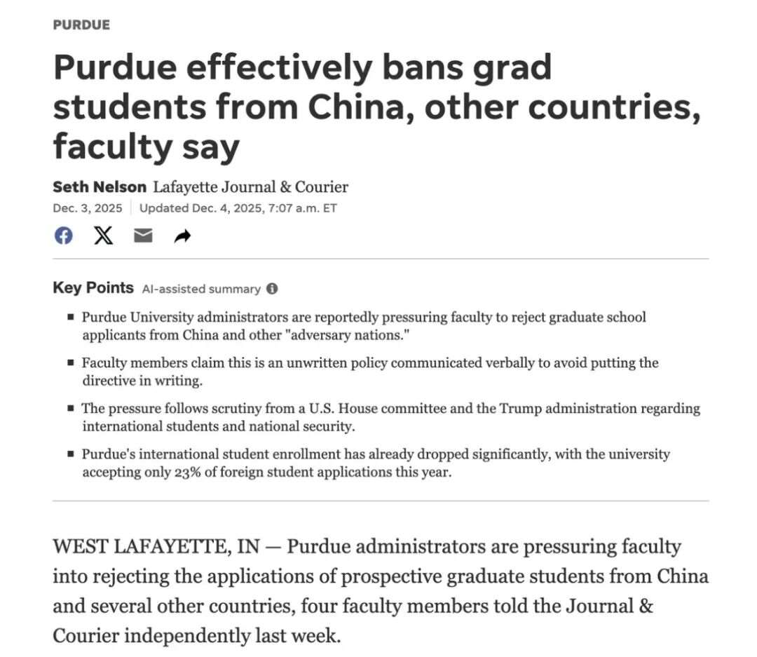 6月份,普渡大学正式通过了一项针对上诉“敌对国家”的政策,禁止教职员工与这些国家建立财务和招生层面的机构联系。虽然这项公开政策并没有明确禁止招收个体学生,但目前的内部压力表明,执行层面已扩大化。